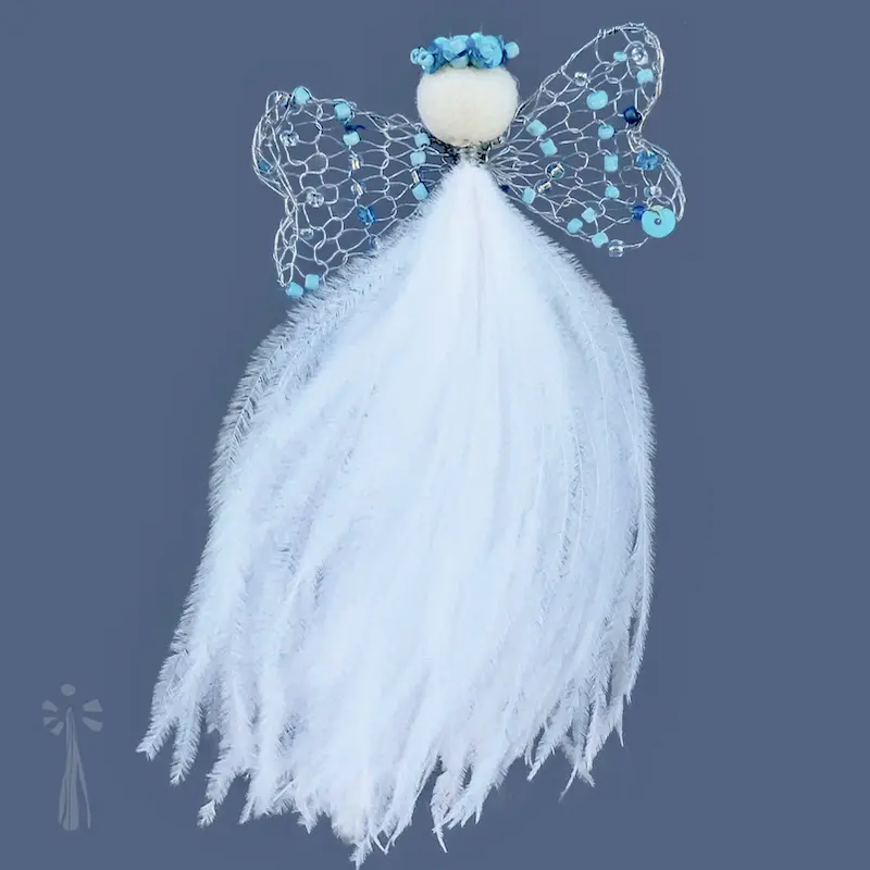 The medium feather angels measure approx 15 – 17 cm, and they look so majestic hanging in a window, or at a prominent spot on the Christmas tree. You will notice that the medium feather angels look more and more grand the longer their feathers are exposed to air. No wonder the medium feather angels are many Karoo Angels’ clients favourites.